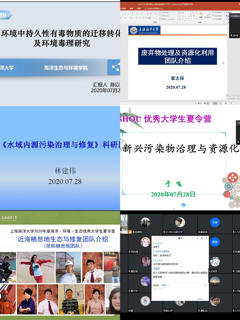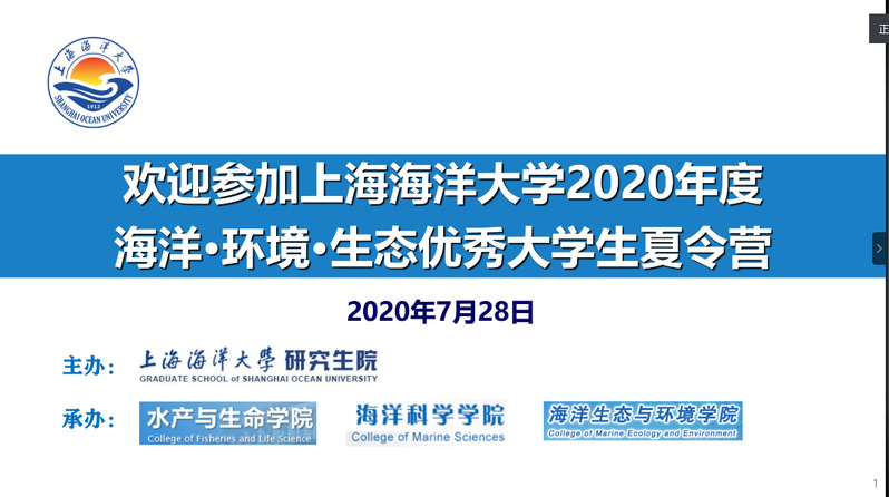 7月28日,上海海洋大学2020年度海洋·环境·生态“优秀大学生暑期夏令营”活动以线上会议形式正式开展,经前期宣传、报名遴选,有来自大连海洋大学、天津农学院、盐城工学院、河海大学、江苏海洋大学、安徽科技学院、浙江海洋大学、北部湾大学以及上海海洋大学等近所高校的同学参加了本次夏令营。本次活动由校研究生院主办,海洋生态与环境学院、海洋科学学院、水产与生命学院联合承办。