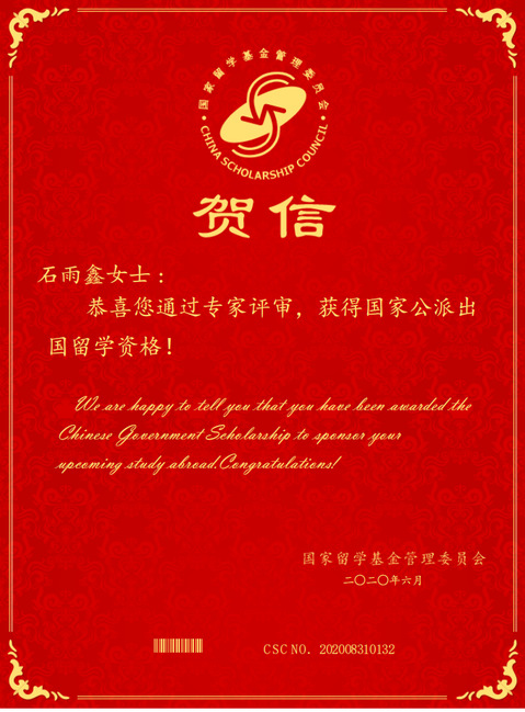 近日,国家留学基金委公布了2020年国家建设高水平大学公派研究生项目的录取名单,我院2017级硕士研究生石雨鑫同学获得国家建设高水平大学公派攻读博士学位资助资格,将前往荷兰瓦格宁根大学,攻读博士学位,这是我院学生首次获批国家公派出国留学资格。