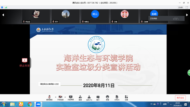 为了更好的宣传垃圾分类,强化垃圾分类自觉行为,加强安全实验室建设,2020年8月11日晚,海洋生态与环境学院通过线上腾讯会议开展实验室垃圾分类宣讲活,参加此次宣讲活动的有学院党委副书记黄永莲老师、实验室主任王春峰老师、辅导员方晨光老师、高祯聆老师,以及学院全体在校研究生。