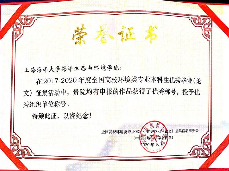 2020年10月17日,在成都召开的第九届中国环境院所长论坛上,我校荣获全国高校环境类专业本科生优秀毕业设计(论文)征集活动优秀组织单位称号。