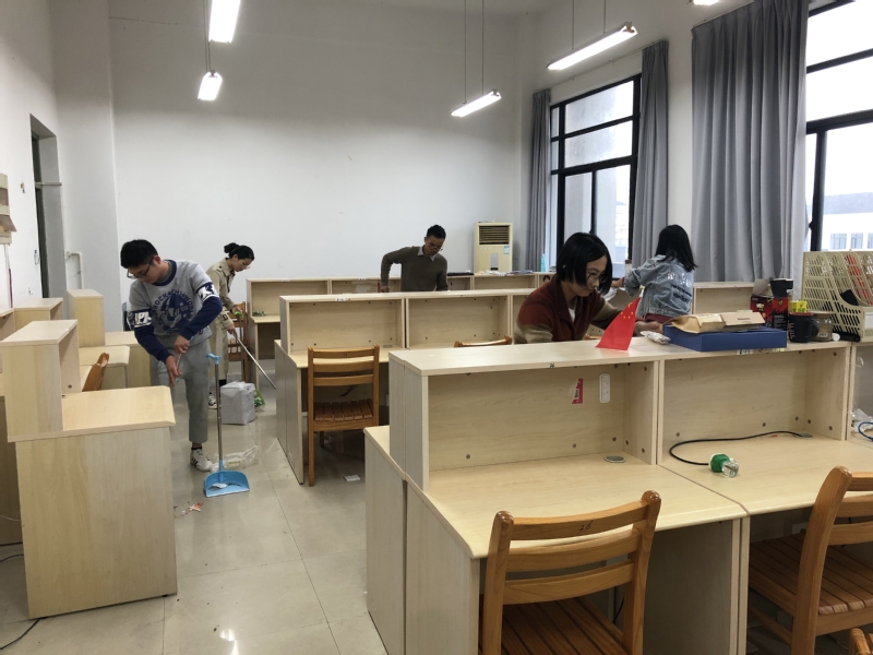 由于自习室近期刚完成设备安装施工,现场杂物堆积,桌面、地面布满灰尘。参加活动的党员不怕脏,不怕累,抄起扫把清理地面,拿起抹布擦拭桌面,卷起袖子搬运杂物,干得热火朝天。用了一个多小时,党员们将杂乱无章、灰尘满天的自习室打扫得整洁光亮。