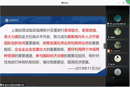2020年10月30日,学生联合党支部特邀海洋生态与环境学院党委委员、学院行政教辅支部书记彭自然线上为支部全体党员上了“四史”主题党课:《中国(上海)自由贸易试验区临港新片区的历史演进与未来愿景》,共同学习临港新片区的“前世今生”。