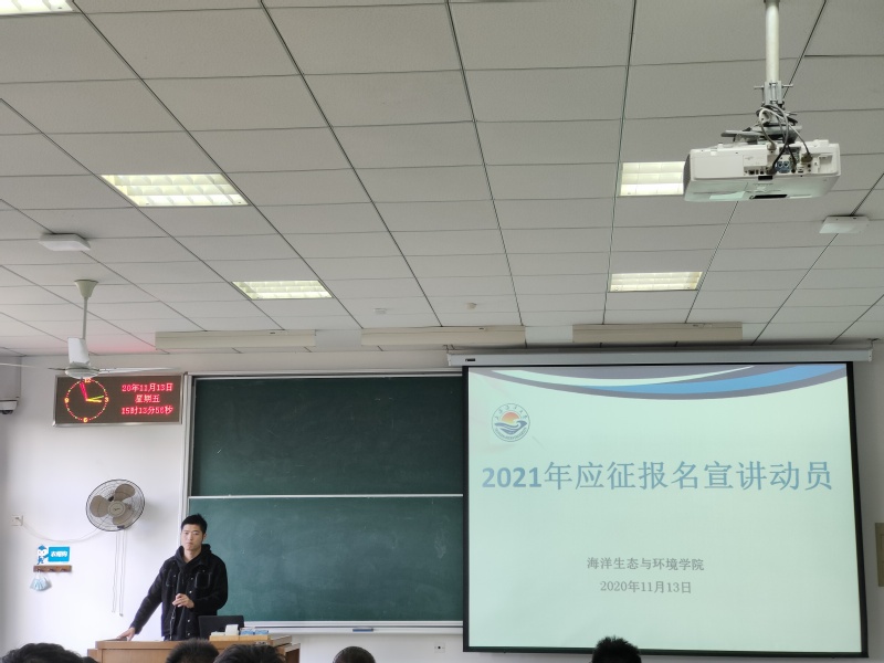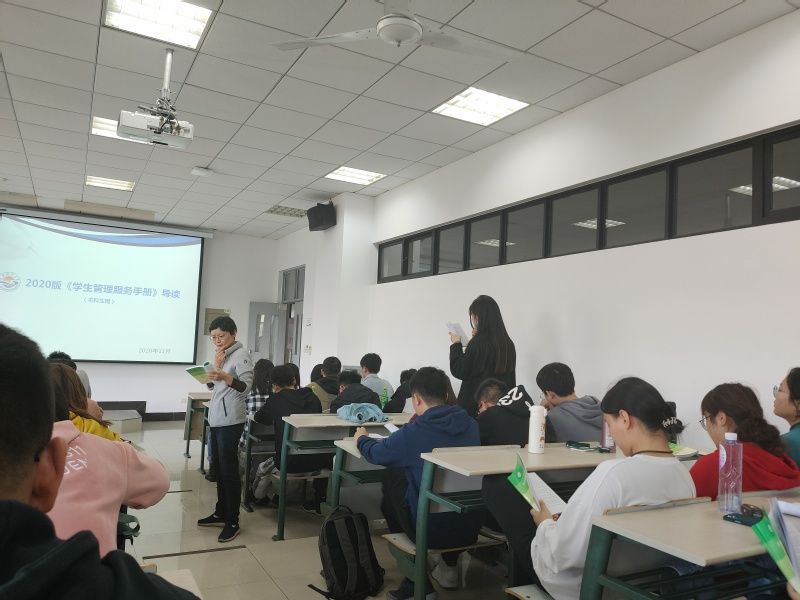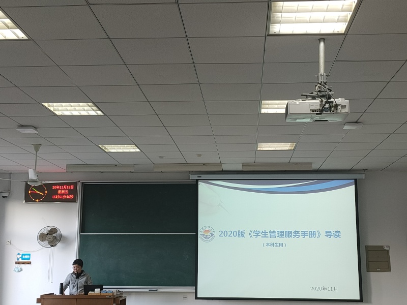 2020年11月13日下午, 海洋生态与环境学院于教学楼4101教室进行了2020级本科生《学生管理服务手册》导读及征兵志愿宣讲,由学院党委副书记黄永莲主讲。全体大一新生到场,大家积极学习,踊跃参与,氛围和谐活泼。