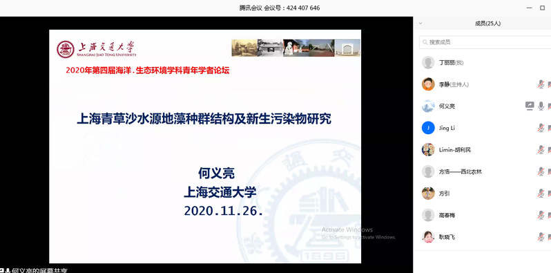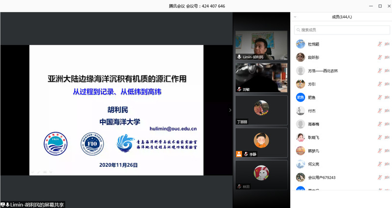 论坛期间,上海交通大学中英国际低碳学院副院长何义亮教授、中国海洋大学胡利民教授分别作了“上海青草沙水源地藻种群结构及新生污染物研究”和“亚洲大陆边缘海洋沉积有机质的源汇作用与环境响应”的学术报告,并与青年学者进行线上交流讨论。