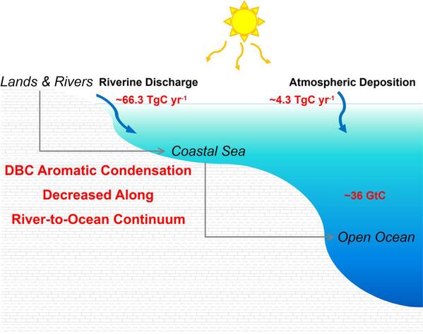 黑碳(Black Carbon, BC)是生物质和化石燃料在不完全燃烧条件下产生的高度芳香碳质副产物,涉及到气候变化、碳循环、环境健康危害等诸多问题,是当前国内外气候和环境等研究领域共同关注的热点。溶解态黑碳(DBC)作为BC降解的中间产物,是海洋溶解态有机碳(DOC)碳库的重要组成部分,涉及全球海洋碳收支,但相关的信息非常有限。本研究基于2014年夏季和冬季在渤黄海大面采集的水体样品,通过对水体中颗粒态BC(PBC)和DBC进行系统分析,并结合团队和其他学者前期在环渤海河流和开放大洋针对DBC开展的相关研究工作,对渤黄海PBC和DBC的时空变化规律和动力学机制以及DBC在沿“河流-近海-大洋”统一体迁移过程中的行为变化进行了细致深入的探讨,获得的主要认识包括:(1)渤黄海PBC和DBC的时空变化主要受控于气候及其诱导的水动力条件(图1);(2)DBC在沿“河流-近海-大洋”统一体迁移过程中,其芳香浓缩程度逐渐降低(图2),可能是由于其在迁移过程中逐渐增加的光化学降解所致;(3)基于我们对DBC定量分析方法的改进和优化,发现前人关于全球尺度DBC的界面通量和全球海洋DBC储库大小的估算结果明显偏低,本研究对其进行了修正,该结果有助于优化DBC的海洋碳循环研究模型(图3)。