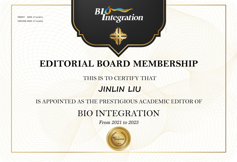 日前,应生物医学领域国际新刊BIO Integration(BIOI,Print Edition: ISSN 2712-0074,Online Edition: ISSN 2712-0082)主编及编委会邀请,上海海洋大学海洋生态与环境学院博士研究生刘金林加入该期刊编委会,成为该刊学术编委会成员。