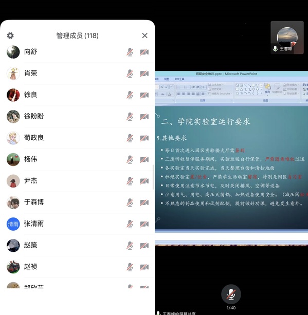 为贯彻落实市教卫党委、市教委的疫情防控工作要求,传达学校疫情防控各项管理规定,引导在校生严格遵守学校疫情防控措施,提高寒假留校生安全意识,保证寒假留校学生度过安全、祥和、温馨的春节,海洋生态与环境学院于1月26日召开线上寒假留校生教育管理会议。学院党委副书记黄永莲、副院长林军、实验室主任王春峰、研究生辅导员徐帆和全体实验办人员、留校研究生共计116人参加了会议,会议由徐帆主持。
