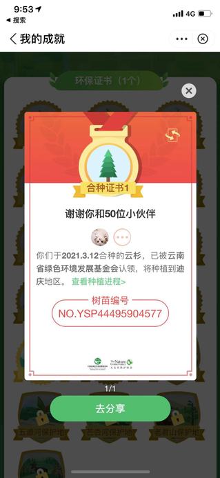 为了确保疫情防控和植树造林两不误,满足支部党员和发展对象积极参与植树活动的需求,支部成员在支付宝平台蚂蚁森林程序中进行了植树活动。为了能在3月12日当天顺利植下一颗树,2021年1月以来,支部15名党员和36名入党积极分子共在支付宝平台蚂蚁森林程序中积累了272850g减排能量,最终在云南迪庆种得云杉树1棵。