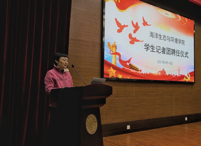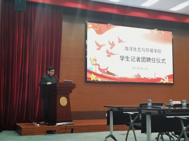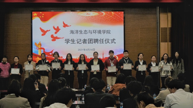 在建党100周年之际和“十四五”开局之年,为强化学院宣传工作,更好地发掘报道学校、学院发展大事,传播时代声音,上海海洋大学海洋生态与环境学院成立了学生记者团。2021年4月14日,海洋生态与环境学院在图文信息中心102会议厅举行了学生记者团聘任仪式,宣传部副部长屈琳琳、宣传部于光磊,学院党委副书记黄永莲,党委委员、党办主任彭自然,党委委员、团委书记方晨光,以及全体学生记者团成员参加了仪式。