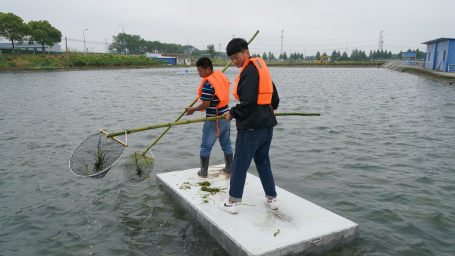 揭牌仪式后,在海洋生态与环境学院教师和基地带教人员的指导下,学生分组参加了“种水草”和“捞水绵”两项劳动。