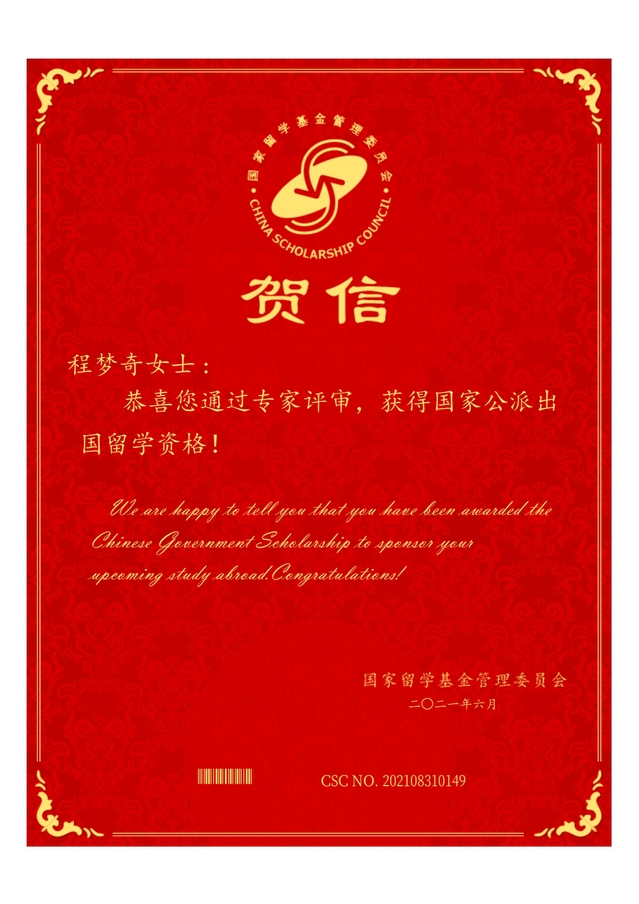 程梦奇同学此次喜获国家公派出国留学资格,是海洋生态与环境学院继2017级硕士研究生石雨鑫同学获得国家建设高水平大学公派攻读博士学位资助资格,前往荷兰瓦格宁根大学攻读博士学位后,连续两年有学生获批国家公派出国留学资格。