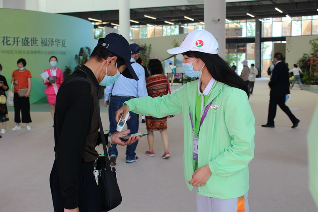 耿婉璐在百花馆入口处为参观游客测量体温,并提醒游客佩戴口罩。她说,“在志愿服务过程中,大部分游客非常配合和支持我们的工作。在疫情防控常态化背景下,我们要防患于未然,让游客们拥有一次美好而难忘的游园经历。”