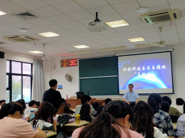 6月8日在3108教室,上海海洋大学海洋生态与环境学院院长高郭平以“打好科技自立自强的主动仗”为题,为2019级学生作形势政策报告。