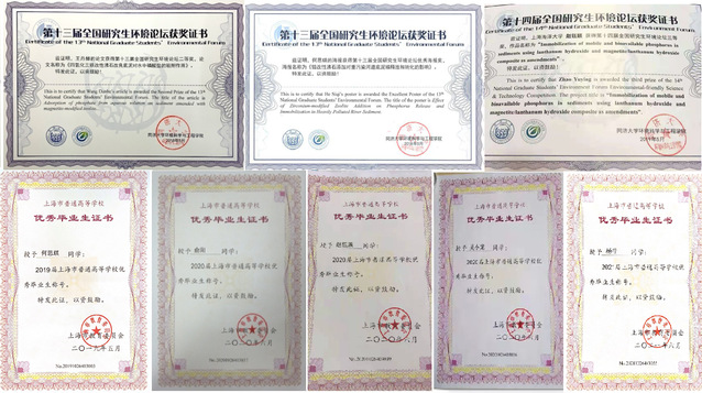 团队指导13名硕士研究生获得“上海市普通高等学校优秀毕业生”称号,10名硕士研究生获得国家奖学金。研究生发表国际知名环境类期刊学术论文30余篇,入选ESI高被引和热点论文1篇。4名硕士研究生的学位论文被评为上海海洋大学研究生优秀学位论文。硕士研究生参与申请并授权国家发明专利9项。实用新型专利3项。4名硕士生的学术论文被全国研究生环境论坛所收录,其中2人获得口头汇报二等奖,1人获得三等奖,1人获得优秀海报奖。指导研究生荣获第三届“汇创青春”上海市大学生文化创意类作品展示活动环境设计类三等奖,第二十四届上海高校学生创造发明“科创杯”发明创新三等奖。