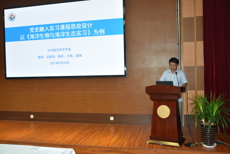 建党精神还生动地体现在三全育人过程中,生态教工党支部委员汪振华副教授在交流会上做了题为“党史融入实习课程思政设计”的经验分享。教学团队把“以建党百年为背景,探索生态文明建设实践成果,开展社会调研和红色教育”写进了《海洋生物与海洋生态学实习》课程目标中。在7月份的野外实习中,教学团队带领学生调查了解实习地嵊山的渔业历史和现状,见证新中国成立以来在党的领导下当地渔民发展海洋渔业、开发利用海洋的成就,体会近年来嵊山加快乡村振兴步伐,打造“生态+”发展模式。他们还利用红色资源开展思政教育,带领学生瞻仰蒋继周烈士纪念塔,学习烈士勇救海难落水渔民、英勇牺牲的英雄壮举。