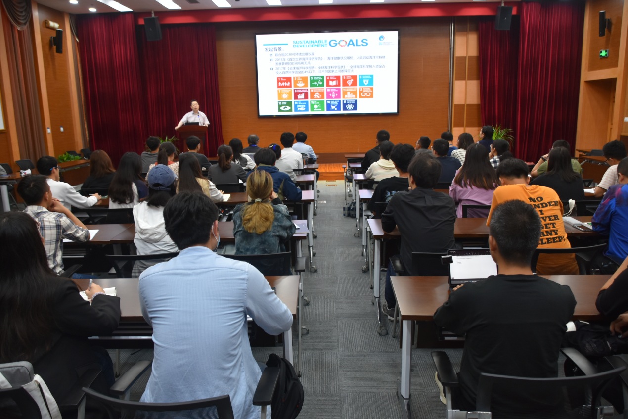 乔方利研究员首先介绍“联合国海洋科学促进可持续发展十年(2021-2030年)”(简称“海洋十年”)计划,为与会师生们介绍了“海洋十年”的重点关切。在此基础上,他进一步介绍了目前海洋与气候模式发展过程中面临的重大科学挑战,并详细介绍了由其团队提出的浪致混合理论及其验证和应用。浪致混合理论的提出,克服了海洋模式半个世纪的模拟与预报难题,大幅提高了数值模式的模拟精度,实现了我国海洋模式从长期跟随到科技引领的跨越。此外,乔方利研究员介绍了基于该原创理论开发的浪潮流耦合海洋模式在国家防灾减灾中的重要应用案例,呼应了报告开头“海洋十年”所提出的可持续发展目标,为国家可持续发展打造了保障平台。