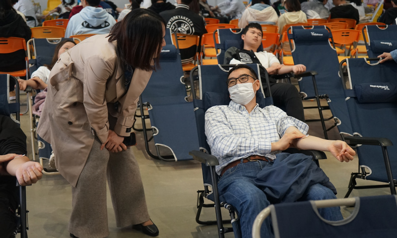 上午9时,报名献血的师生陆续到达学生活动中心献血现场。在医务人员和现场志愿者的热心引导下,师生依次排队填写献血信息表、接受体检和阅读注意事项后陆续开始献血。