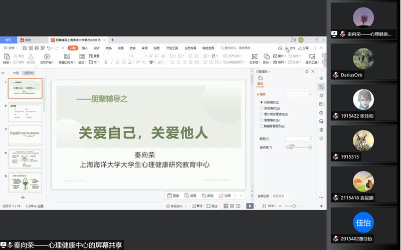 为守护疫情防控期间学生身心健康,切实加强心理疏导和心理健康保护、教育,提高学生应对疫情的心理素质,上海海洋大学海洋生态与环境学院于3月15日组织“关爱自己关爱他人”线上心理培训与交流活动。学院学生骨干、寝室长、学生志愿者参与,邀请学校大学生心理健康研究教育中心主任秦向荣受邀参加并作培训讲座。