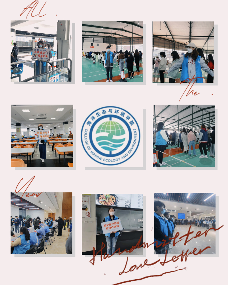 在这疫情防控关键时刻,海洋生态与环境学院的学生志愿者们坚守在岗,倾情付出,携手抗疫,共克时艰。蔚蓝的制服衬托出你们矫健的身影,洁白的口罩难掩你们青春的笑容。风雨同舟,感谢有你,你们是最美的人。心有所信,方能行远,只要我们凝心聚力,携手前行,就一定能迎来明媚的春天。