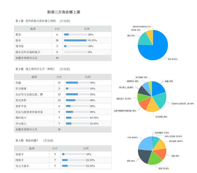 于飞发放调查问卷“阳春三月你在哪上课”,了解学生们的学习生活情况,和辅导员一起协调解决学生反映的购买课程绘图用品、打印习题集等问题。