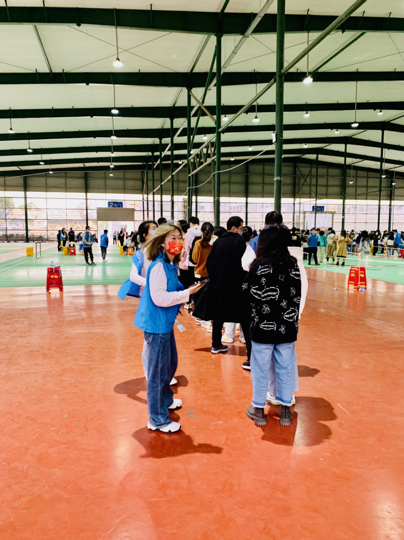 3月3日的核酸检测现场,一位后勤阿姨的健康云登录异常,并且没有带身份证,寻求志愿者帮助。见到阿姨非常着急,志愿者们让阿姨给家人打电话,问出身份证号码后在自己的健康云上进行非本人信息登记。接电话的是阿姨的老伴,操着浓重的南方乡土口音。周晚晴和校艺术团团长彭铖都是南方人,他们一人输入信息一人校对,两人配合着帮这位阿姨成功地预约登记了核酸检测。