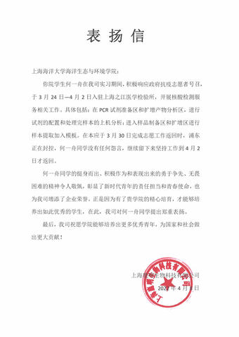 近日,上海海洋大学海洋生态与环境学院收到了上海鹿明生物科技有限公司发来的表扬信,对2018级环境科学专业本科生何一舟在PCR核酸检测志愿工作中的突出表现给予了高度赞扬。