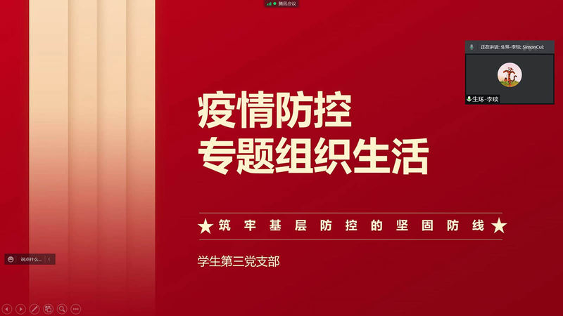 4月6日,学生第三党支部线上召开疫情防控专题组织生活会。组织委员李琰带领党员开展了“深入学习贯彻习近平总书记关于疫情防控的重要指示精神,贯彻落实孙春兰副总理考察上海特别是在考察上海交通大学时提出的有关工作要求”的相关内容学习,号召支部党员坚决贯彻落实党中央、上海市委和学校学院党委各项防控政策。会后分享环节,全体党员进行了热烈讨论。