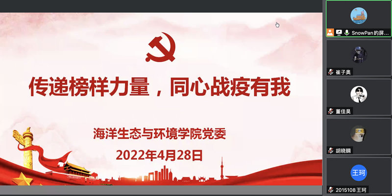 4月28日,上海海洋大学海洋生态与环境学院分党校组织开展“传递榜样力量 同心抗疫有我”主题交流分享会。学院环境教工党支部书记詹艳慧、学生党支部书记高祯聆、研究生代表周晚晴、本科生代表彭铖等在会上分别讲述了自己的抗疫故事和切身体会,积极分子培训班学员悉数参加。会议由学院党委专职组织员潘雪主持。