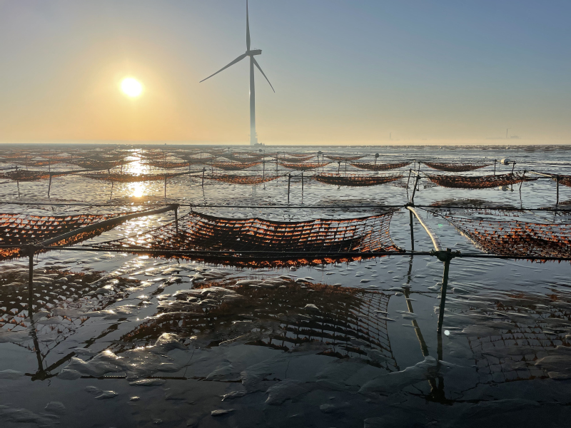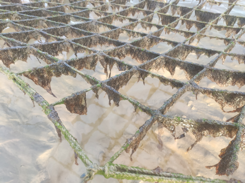 7月25日,实践团队来到了江苏省连云港市连云区海州湾街道西墅村探寻紫菜养殖新模式。西墅村是连云港紫菜养殖业发展的一个缩影。在上世纪九十年代末传统海产品养殖效益下降,西墅村开始转型探索条斑紫菜养殖并获得成功,成为名副其实的“紫菜第一村”。怎么才能在减少紫菜养殖规模的同时,做到产业升级转型呢?西墅村找到了新的突破口。通过实地调研走访当地紫菜养殖户,团队了解到以往的紫菜养殖海域现在一半进行紫菜养殖,一半进行贝类养殖,主要是三倍体太平洋牡蛎,还有一些双头蛏、美国红贝、蓝哈品种。这种贝类藻类间养新模式,不仅可充分利用海区资源,提高单位面积紫菜、牡蛎产量,促进渔民增收致富,还能有效防止养殖海域富营养化和贝类暴发性病害,实现可持续发展。