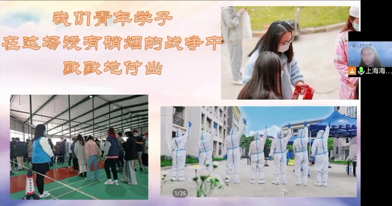 徐寒雨在讲述抗击“非典”精神时加入今年“大上海保卫战”中她和身边同学用自己的实际行动传承抗击新冠病毒疫情,筑起校园抗疫防线的例子。张毓妮讲述抗震救灾精神,引用了去年河南洪灾中海洋生态与环境学院一名优秀的退伍学姐奋不顾身前往灾区救援的事迹;何凯皙讲述劳模精神,通过她在公益教学时的学生在家主动承担家务,积极参与劳动的实例,呼吁更多人弘扬劳模精神,激发奋进力量……