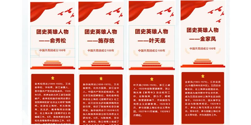 为宣传百年团史,明悟使命担当,小组成员梳理历史脉络、汇总学习资料,以所学所思制作了“团史英雄人物”系列和“上海共青团发展史”系列宣传材料,介绍参与创建上海社会主义青年团的金家凤、中国社会主义青年团第一任书记俞秀松、投身革命影响巨大的施存统、为革命事业奋斗到生命最后一刻的叶天底等革命先辈的生平事迹,以及他们为革命做出的努力与贡献,让更多青年认识、了解、敬仰这些为党为团苦苦追寻、奋斗终生的英雄。通过实践,小组成员对上海共青团的发展历史有了更全面、具体的了解。