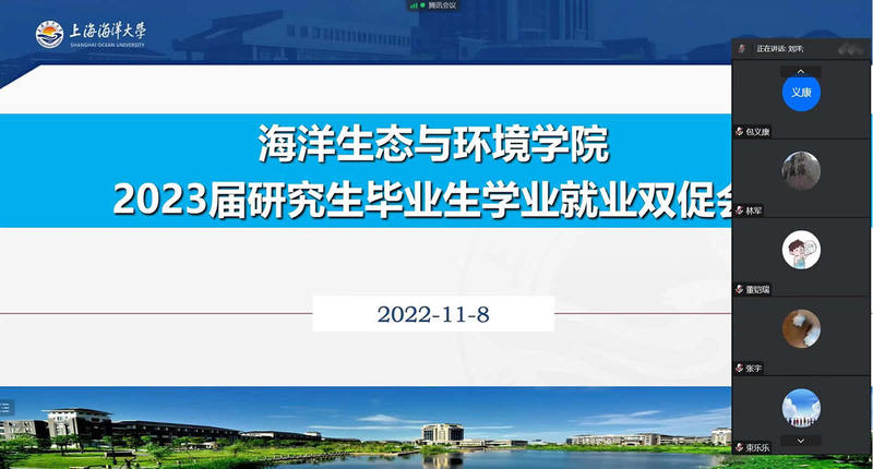 为扎实推进毕业生学业就业工作,上海海洋大学海洋生态与环境学院于11月8日在线召开了2023届毕业研究生学业就业促进会,学院党委副书记黄永莲、副院长林军、研究生秘书刘洋、研究生就业联络员徐帆、往届毕业生代表出席,全体2023届研究生毕业生参会。会议由徐帆主持。