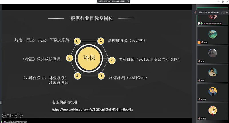 接着,大会进入学长学姐分享求职经验的环节。来自上海甲贝医药科技有限公司的汪茂秋、元生物技术(上海)股份有限公司的王蝉娟、上海水务建设工程有限公司的丁经祥、上海崇明区储备人才吴照举、上海浦东威立雅自来水有限公司的刘妞妞、钦州市海洋局的何国风分别介绍了各自所在行业的工作内容和就业前景,分享了详实的求职准备过程和经验技巧。其中,汪茂秋不仅分析了生态学专业所有可能就业的交叉学科和领域,还分享了自己撰写英文简历、英文邮件申请公派留学博士的经历,内容兼具专业性和实用性。专注于考取公务员和事业单位的何国风,分享了自己备考、以及短时间内将申论提高到70分以上的经验技巧,向同学们推荐了实用的学习材料。随后进入自由交流提问环节,毕业班学生积极提问,学长学姐耐心解答,并互相留下联系方式,后面进一步沟通联系。