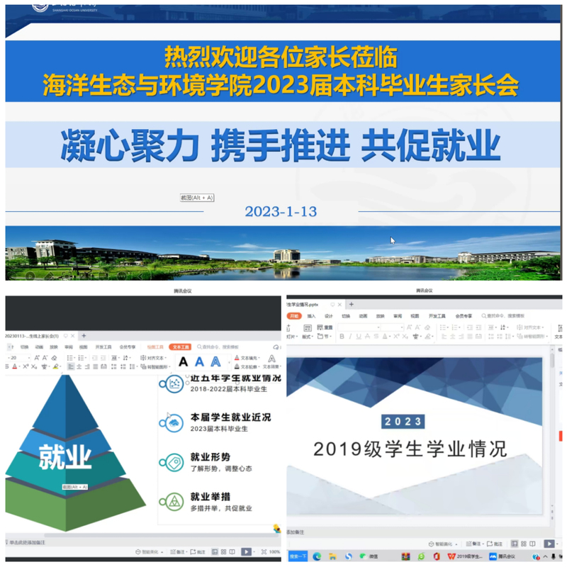 为加强家校沟通协作,共同做好毕业班就业工作, 1月13日,上海海洋大学海洋生态与环境学院通过腾讯会议召开2023届本科毕业生家长会。校就业创业服务中心主任孙红刚、学院党委副书记、院长高郭平,党委委员、副院长林军,党委委员王方方,学生秘书杨丽丽,毕业班辅导员高祯聆,课程导师王凯、鲁仙、赵志淼,以及2023届毕业班学生家长参加会议。