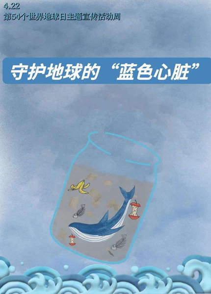 简介:海洋鱼类和其他海洋生物是人类重要的食物来源,许多工业制品的原材料也来自海洋。人们在海洋深处发现蕴藏丰富的石油、天然气有助于解决人类面临的能源危机。海洋为人类生存、发展、进步作出无私贡献。然而,人类对于海洋这个亲密朋友似乎并未足够重视。在许多人眼中,海洋有取之不尽的鱼类、鲸和其他野生动物,因而对海洋采取疯狂的掠夺式攫取,以满足口腹之欲、生活之需。画面主体是海洋和瓶子,瓶子里的鲸鱼和垃圾表示海洋环境遭受严重污染,海洋生物生存受到严重威胁,亟需我们保护海洋。为了确保人类继续生存,务必要“把握时机,行动在当下”,切实保护人类赖以生存的蓝色心脏——海洋,保护海洋也就是保护人类共同的地球家园!(设计团队:蒋杰锋、张静、余嘉玲、刘训鑫、龚琦)