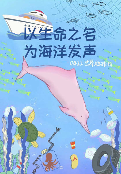 简介:海报中间是中华白海豚,由于人类活动影响,在2008年被列为濒危物种;位于海报下方的塑料瓶、铁链、橡胶等都是左上方船只经过所带来的海洋垃圾;右上方的渔网正在过量捕捞鱼;人类丢进海里的罐子套住了章鱼……这些本不该出现在海洋中的垃圾正在人类看不见的地方悄然改变着海洋生态环境。但一些人类行为正在破坏海洋环境,威胁海洋生物生存。我们呼吁要珍爱地球与自然和谐共生,以生命之名为海洋发声。(设计团队:赵娅茹、李倪、桂美辰、戴晗钰、周佳怡)