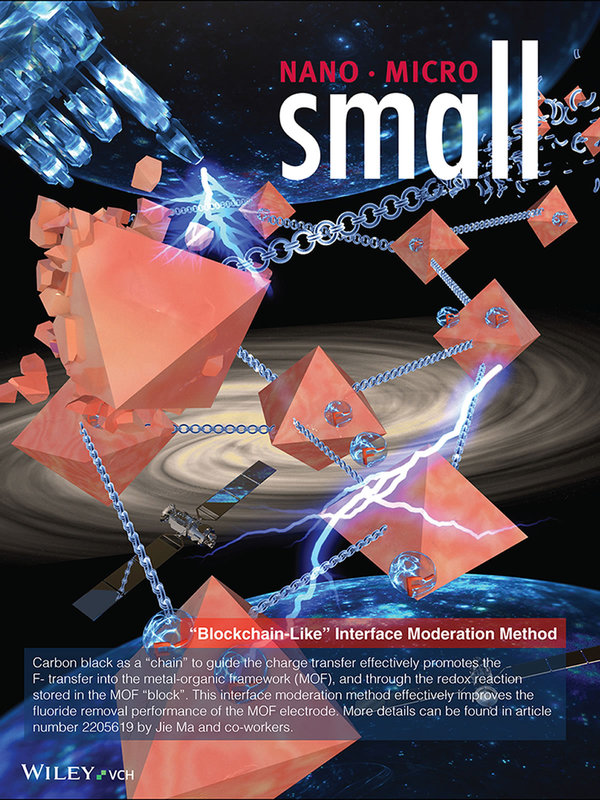 上海海洋大学海洋生态与环境学院于飞副教授团队在电容去离子新技术研究领域,以第一作者发表基于“类区块链”效应MIL-101(Cr)高效除氟研究论文《“Blockchain-Like” MIL-101(Cr)/Carbon Black Electrodes for Unprecedented Defluorination by Capacitive Deionization》(Small 2022, 2205619),首次入选国际知名期刊《Small》封面论文。于飞领衔的科研团队长期从事环境功能材料及新兴污染物控制技术研究,该论文也是她自2017年入职以来潜心研究,不断积累完成的又一高质量科研成果。