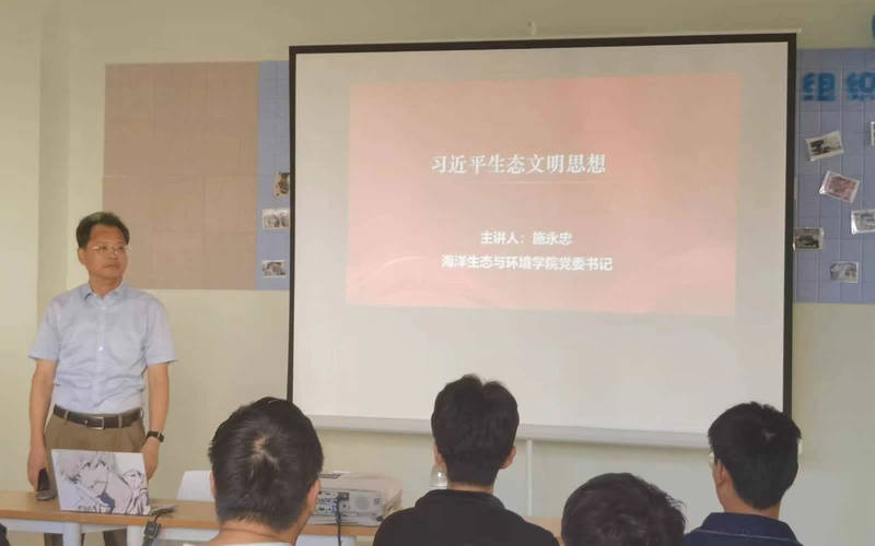 为持续深入开展学习贯彻习近平新时代中国特色社会主义思想主题教育,践行习近平生态文明思想和党的二十大精神,10月31日,上海海洋大学海洋生态与环境学院党委书记施永忠在第三小区活动室为学生党员代表讲授“习近平生态文明思想”专题党课。