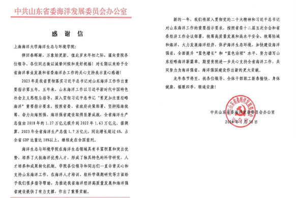 1月30日,中共山东省委海洋发展委员会办公室专门致信学院,对上海海洋大学海洋生态与环境学院(现海洋科学与生态环境学院)长期以来在海洋人才培训、软科学课题研究等方面对山东海洋工作的支持表示感谢。