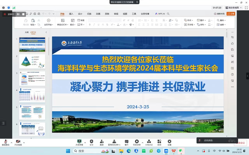 3月25日,上海海洋大学海洋科学与生态环境学院线上召开2024届本科毕业生家长会。学校就业创业中心主任孙红刚,学院党委副书记王方方、副院长林军、学生秘书杨丽丽、毕业班辅导员段轲,以及全体课程导师、本科毕业生家长参加会议。