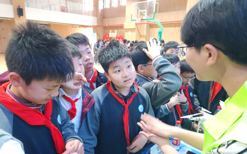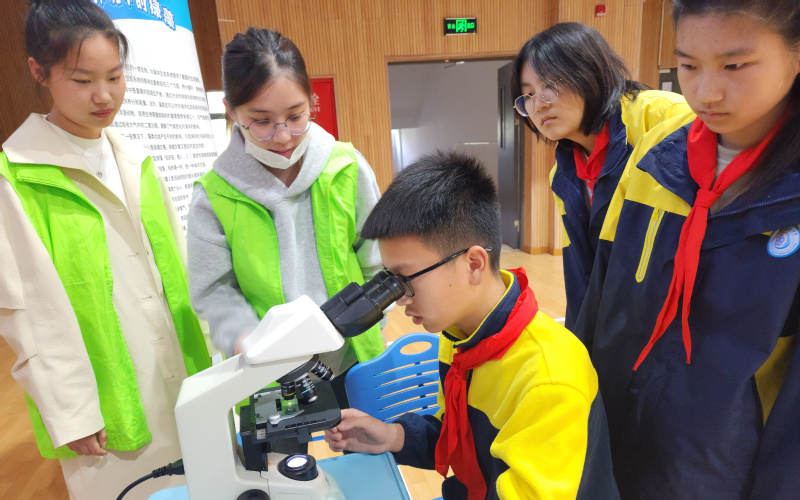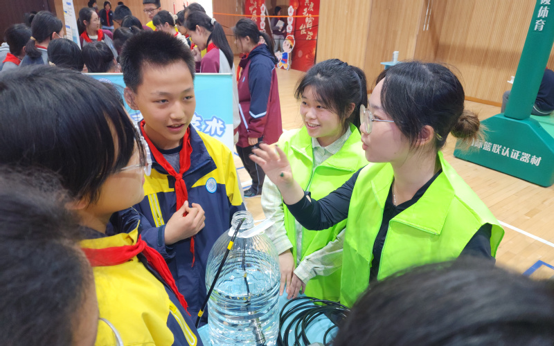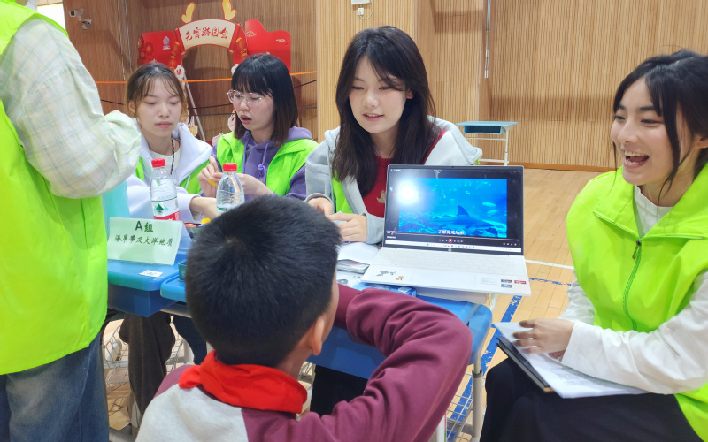 科普活动如火如荼,形式多样、参与性强。学生们络绎不绝地涌向科普摊位,选择感兴趣的主题同大学生哥哥姐姐们交流互动。有的学生学习无人机,了解海洋测绘技术;有的学生参与知识竞答活动,加深对潜水器发展史的了解;有的学生参加垃圾分类游戏,拓展环保知识;有的学生运用显微镜观察绿藻,增强绿潮防治意识;有的学生参与净水活动,亲手搭建净水装置,了解净水过程及其原理……