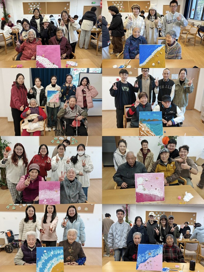手工作品完成后,老人们自豪地展示自己的“海洋世界”,眼中闪烁着喜悦与成就感。临别时分,暖意更浓。老人紧紧握着学员们的手,言语中满是感激与不舍。“你们来了,这儿就热闹了”“谢谢孩子们,祝你们学业进步,前程似锦”……一句句质朴的祝福,如秋日暖阳,照亮了每一个学子的心。学员们也为老人送上亲手制作的贝壳画作为纪念,合影留下这难忘的瞬间。每一幅贝壳画,不仅是艺术的呈现,是心与心之间的温柔对话,更是两代人情感的交融。