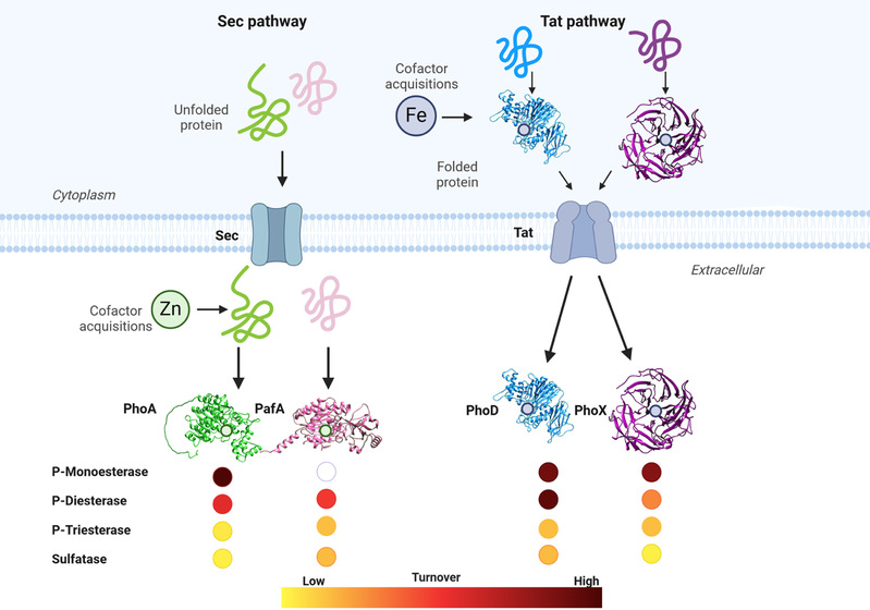 图1:四种碱性磷酸酶家族的分泌及(多)功能性模型。该图展示了从地中海交替单胞菌中纯化的四种碱性磷酸酶所采用的不同分泌机制:PhoA(绿色)和PafA(粉色)利用Sec途径,而PhoD(蓝色)和PhoX(紫色)则采用Tat途径。这些差异化的分泌策略表明PhoD和PhoX在获取辅因子铁方面具有优势,因为Tat途径使这些酶在分泌前能够折叠。相反,PhoA和PafA则依赖其辅因子锌的外部环境浓度。图的下半部分展示了四种不同底物(P-单酯、P-二酯、P-三酯和硫酸单酯)的酶转化率。为可视化较低范围内的差异,数值已转换为对数尺度。所有四种纯化的酶对所有测试底物均表现出酶活性,但PafA对P-单酯无活性。图表来源:2025,Nature Communications