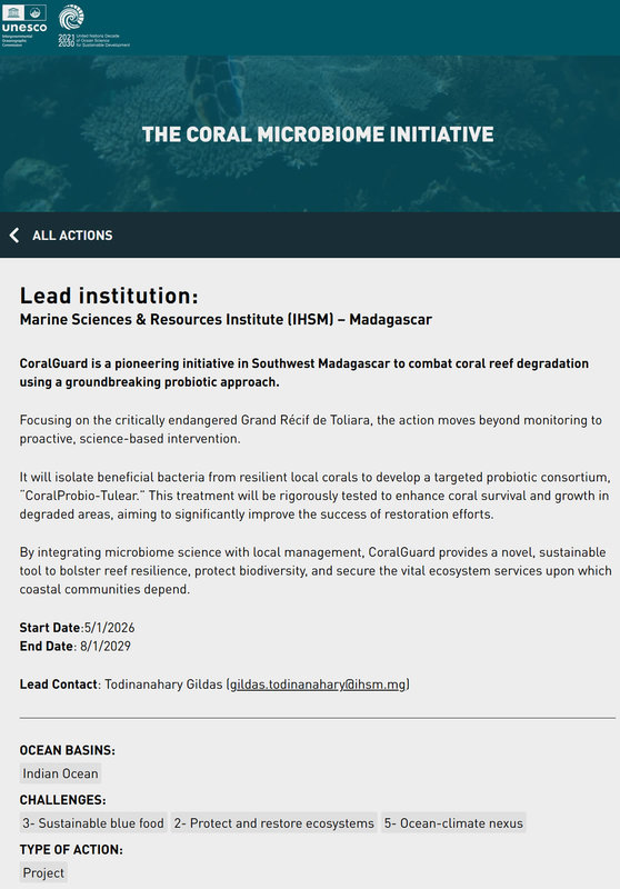 近日,由上海海洋大学牵头的联合国“海洋十年”大科学计划——深海微生物组与生态系统(DOME)再传喜讯:依托DOME申报、由马达加斯加海洋科学与资源研究所(IHSM)牵头的The Coral Microbiome Initiative(珊瑚微生物组专项行动,简称CARE)正式通过联合国“海洋十年”评审并获得官方认证(Endorsed),成为DOME服务全球海洋生态修复、助力最不发达国家海洋能力建设的标志性落地成果。