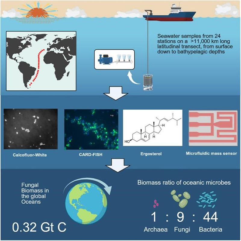 近日,上海海洋大学DOME大科学计划科研团队在国际顶级期刊《细胞》(Cell)发表的研究成果,揭示真菌是海洋碳循环中被长期忽视的“关键角色”。这项由海洋科学与生态环境学院费德里科·巴尔塔 (Federico Baltar)教授和博士后伊娃·布雷耶(Eva Breyer)领衔的研究,其采样区域横跨大西洋,从北纬40°到南纬50°长达1.1万公里。该研究首次精确量化了海洋真菌的碳储存能力,证实真菌对全球海洋碳循环的贡献远超古菌,从而颠覆了细菌和古菌是海洋碳循环主要推手的传统观点。